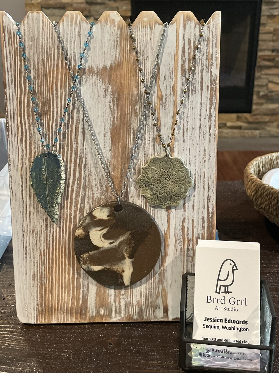 Last spring I did a Very Brave Thing… I went to craft camp one weekend (Thanks Camp Thundercraft by Urban Craft Uprising!). I took some business classes, some inspiration classes, and two craft classes: mosaic rocks and botanical dyeing. This was my display at our show-and-tell. Leaf pendant with rhinestones, swirl pendant, and embossed pendant. Yay!